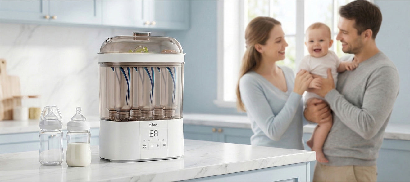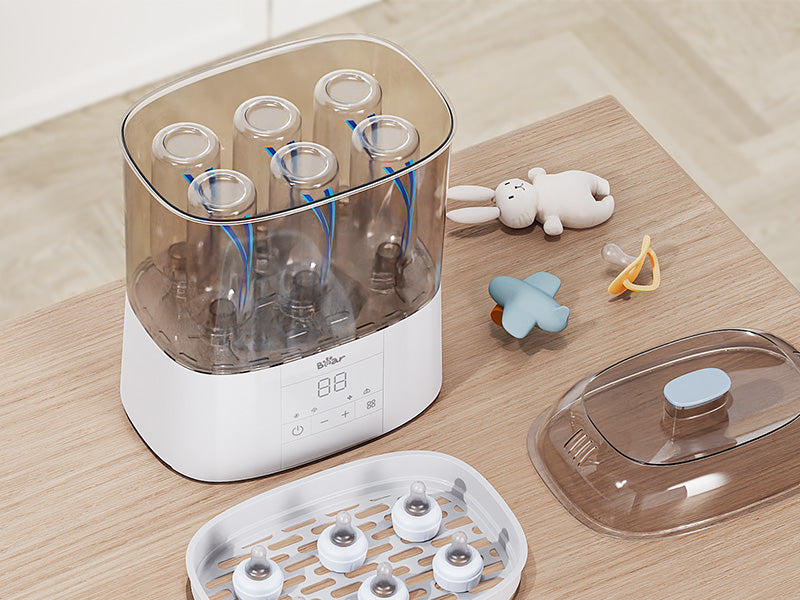 Bear baby bottle sterilizer uses powerful 212°F steam to eliminate 99.9% of bacteria and viruses, ensuring bottles, pacifiers, and pump parts are safe and hygienic.