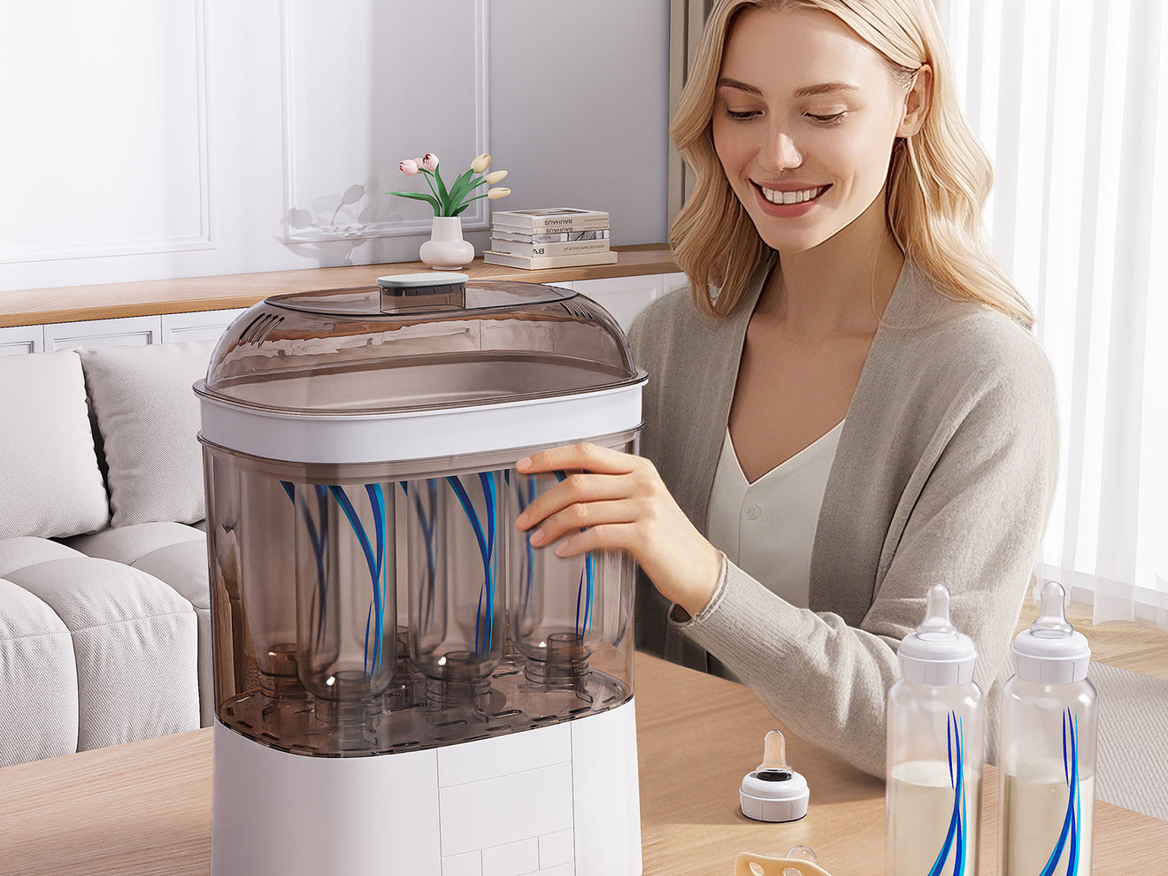 Holds up to 6 standard bottles, nipples, and accessories in one cycle, with three adjustable rack layouts for tall bottles, breast pump parts, or small essentials. Ideal for twins or frequent feeders, it cuts sterilization time by up to 50%.